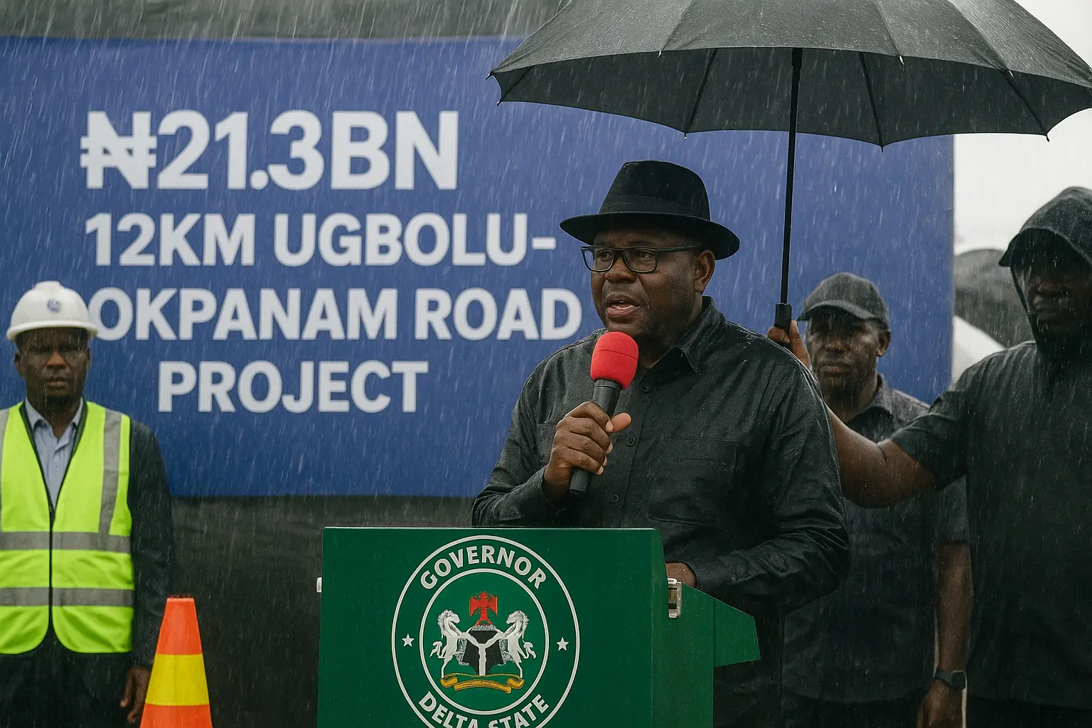 Delta State Governor Sheriff Oborevwori braved heavy rainfall on Oct. 16, to flag off the 12-kilometre Ugbolu-Okpanam road project in Oshimili North Local Government Area. The ceremony had been postponed from the previous week due to bad weather.